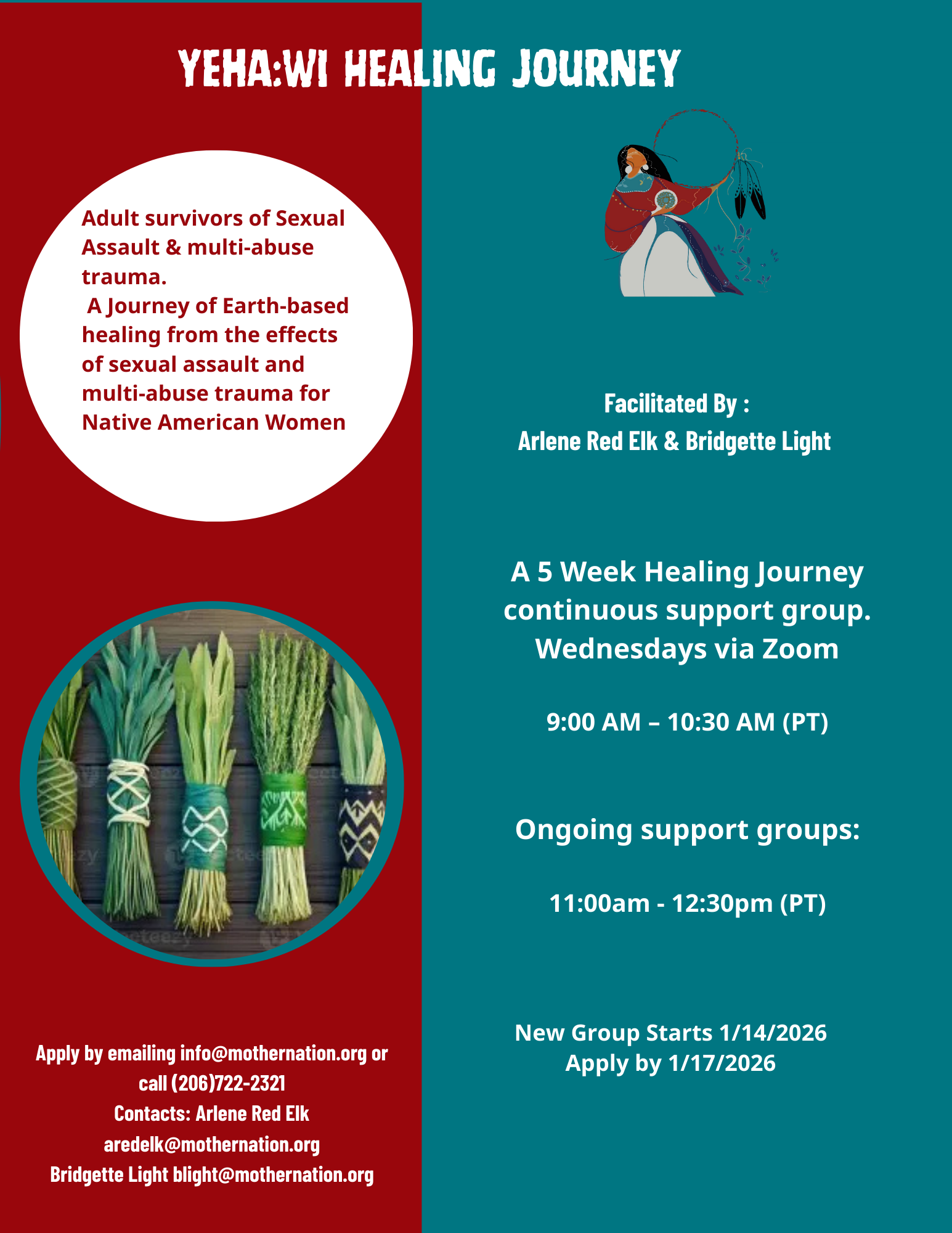 Mother Nation’s cultural services are delivered onsite by credentialed Elders and Staff with the goal to enhance women’s overall health, wellness, and confidence. We provide workshops on a variety of cultural topics, a Circle of Life series focused on healing from trauma, and Tribal Training. All workshops and classes offer CEU through Northwest Indian College (copy of enrollment card required with registration).